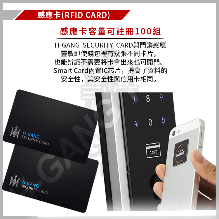 RFID感應電子智慧門鎖系統使用最具保密性的Mifare卡,結合精密的製作技術、電腦技術、微電子技術和現代資訊技術,H-GANG是目前安全性和智慧化程度最高的門鎖系統之一,使用悠遊卡、RFID感應電子智慧門鎖系統裡最具保密性的Mifare 卡可一併相容。