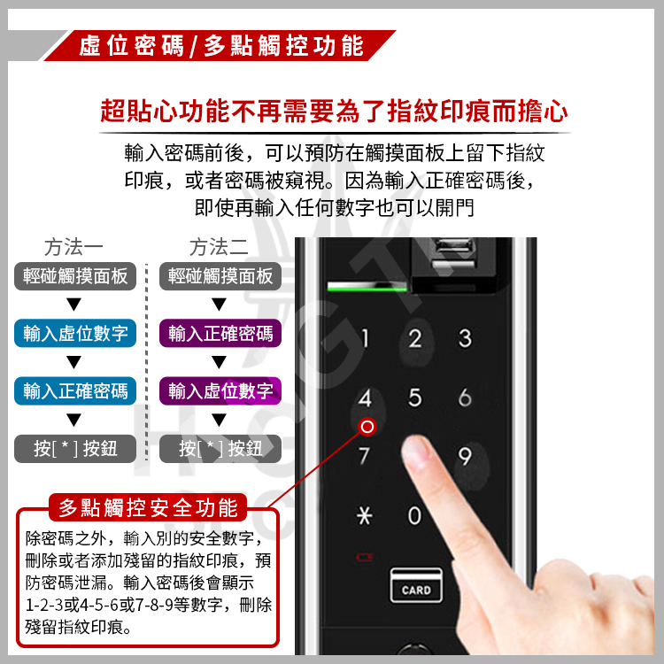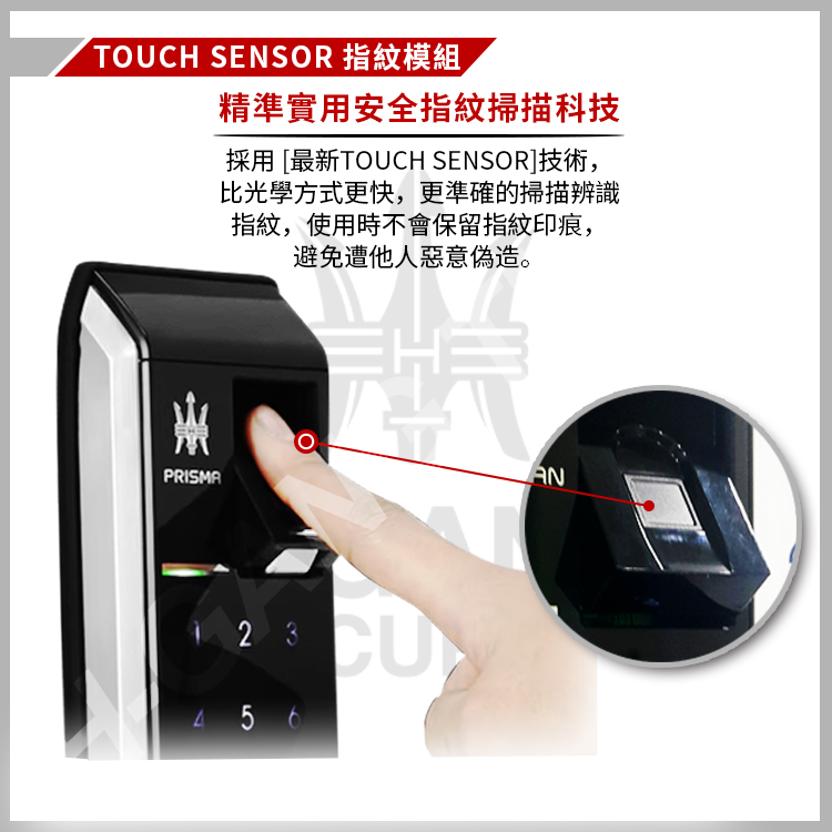 精準半導體指紋掃瞄、有指紋和密碼輸入的雙重功能、精準辨識並排除老人指紋老化、小孩指紋較薄不清晰、和異物附著手指上的狀況、並在指紋掃瞄後不殘留指紋記憶、防止被盜取風險。