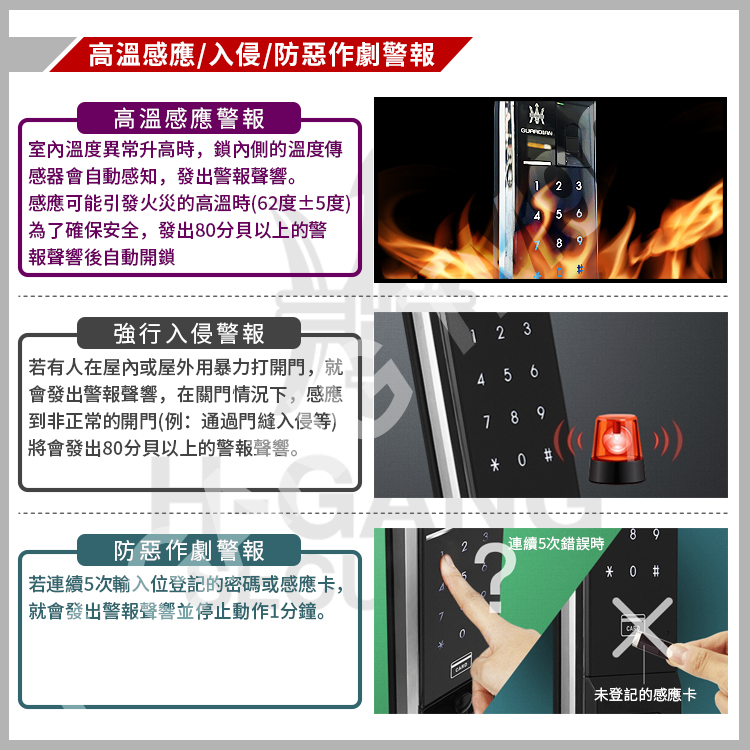 侵入警報,外力撬開或強行破壞鐵門,會觸發警報音嚇阻小偷達到安全效果。