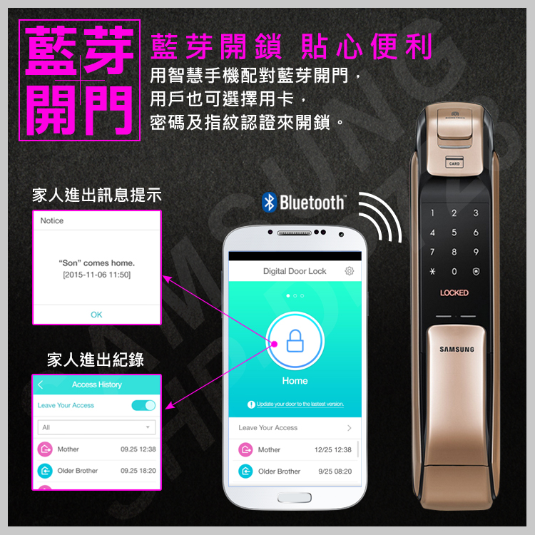 推薦三星 電子門鎖 指紋門鎖 SAMSUNG電子鎖評價 指紋.密碼.卡片.鑰匙手機藍芽開門鎖