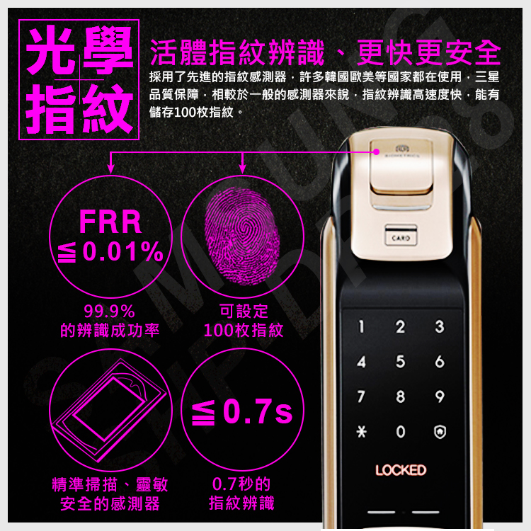 精準光學式指紋掃瞄、有指紋和密碼輸入的雙重功能、精準辨識並排除老人指紋老化、小孩指紋較薄不清晰、和異物附著手指上的狀況、並在指紋掃瞄後不殘留指紋記憶、防止被盜取風險,外觀附有水平手把、結合一體成型的美感。