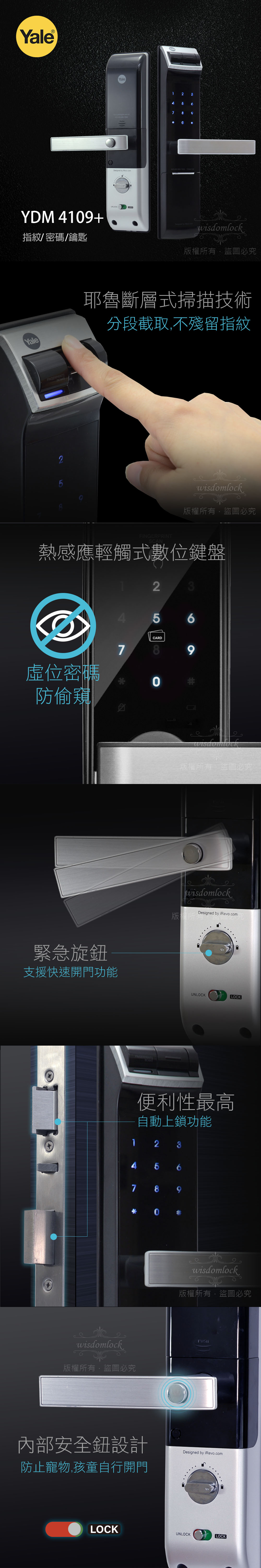精準斷層式指紋掃瞄、有指紋和密碼輸入的雙重功能、精準辨識並排除老人指紋老化、小孩指紋較薄不清晰、和異物附著手指上的狀況、並在指紋掃瞄後不殘留指紋記憶、防止被盜取風險,外觀附有水平手把、結合一體成型的美感。