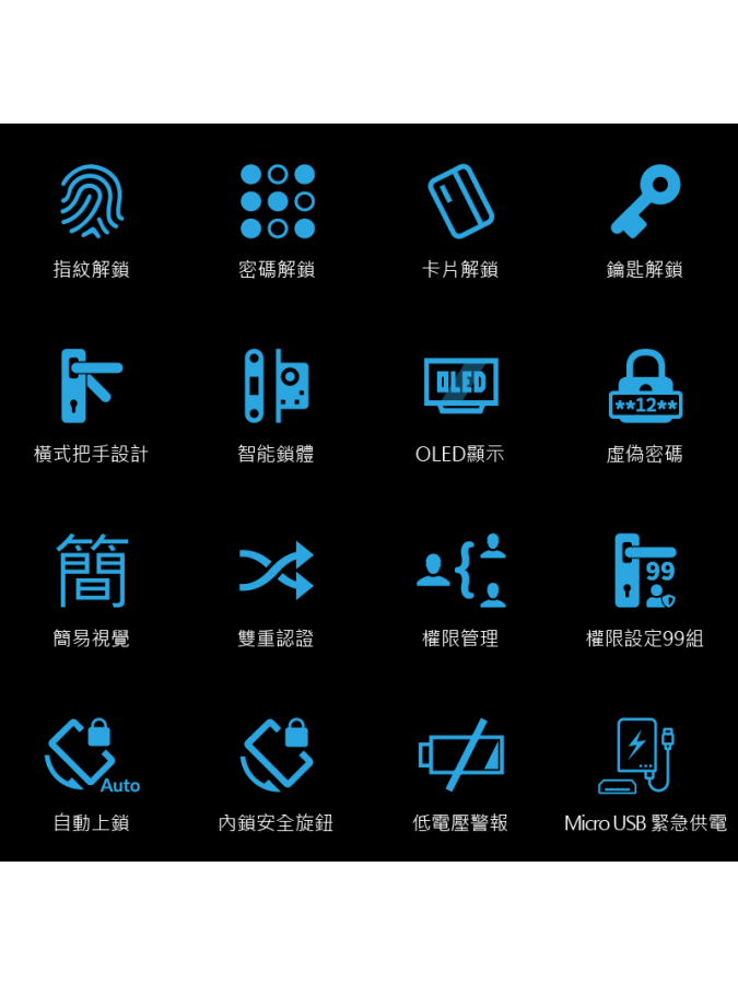 - 可設定為雙重認證開鎖,即指紋+ 密碼雙條件才能開門