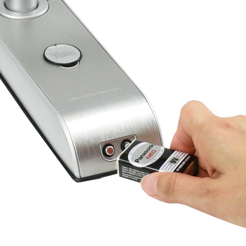 電力來源為4顆3號鹼性電池、能使用3600次、以一天開關10次為準、電力可維持將近一年的時間,電力不足會在一週前以音樂鈴聲告知,若長時間出國在外,電子鎖已完全沒電,可使用9V方型電池臨 時過電操作後、再輸入指紋和密碼來開門。