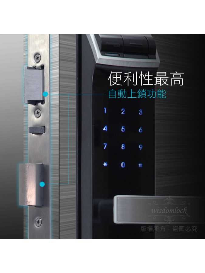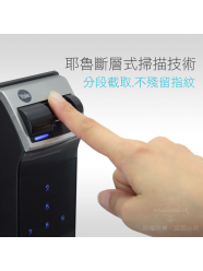 精準斷層式指紋掃瞄、有指紋和密碼輸入的雙重功能、精準辨識並排除老人指紋老化、小孩指紋較薄不清晰、和異物附著手指上的狀況、並在指紋掃瞄後不殘留指紋記憶、防止被盜取風險,外觀附有水平手把、結合一體成型的美感。