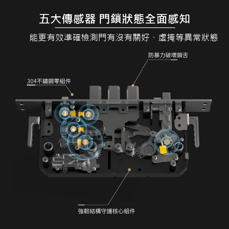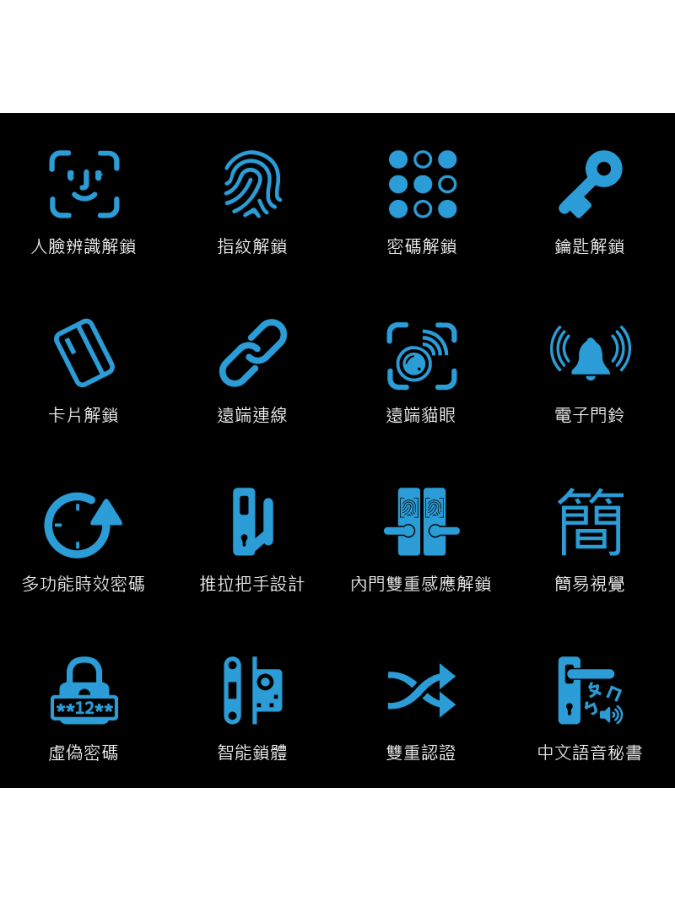 - 鎖體外殼材質:鋅合金+IML 特殊製程烤漆、外殼ABS 塑膠