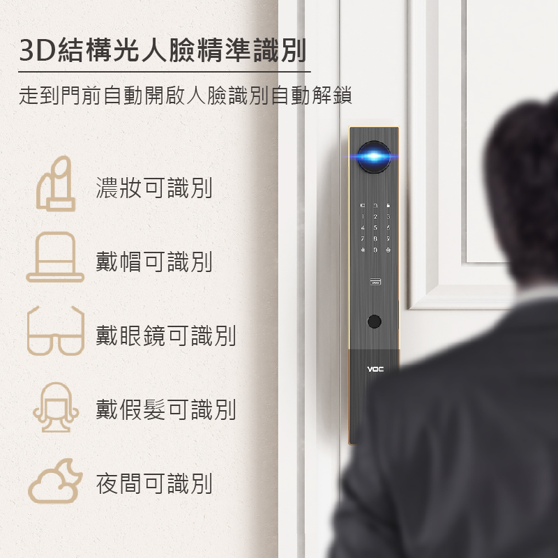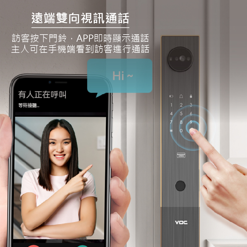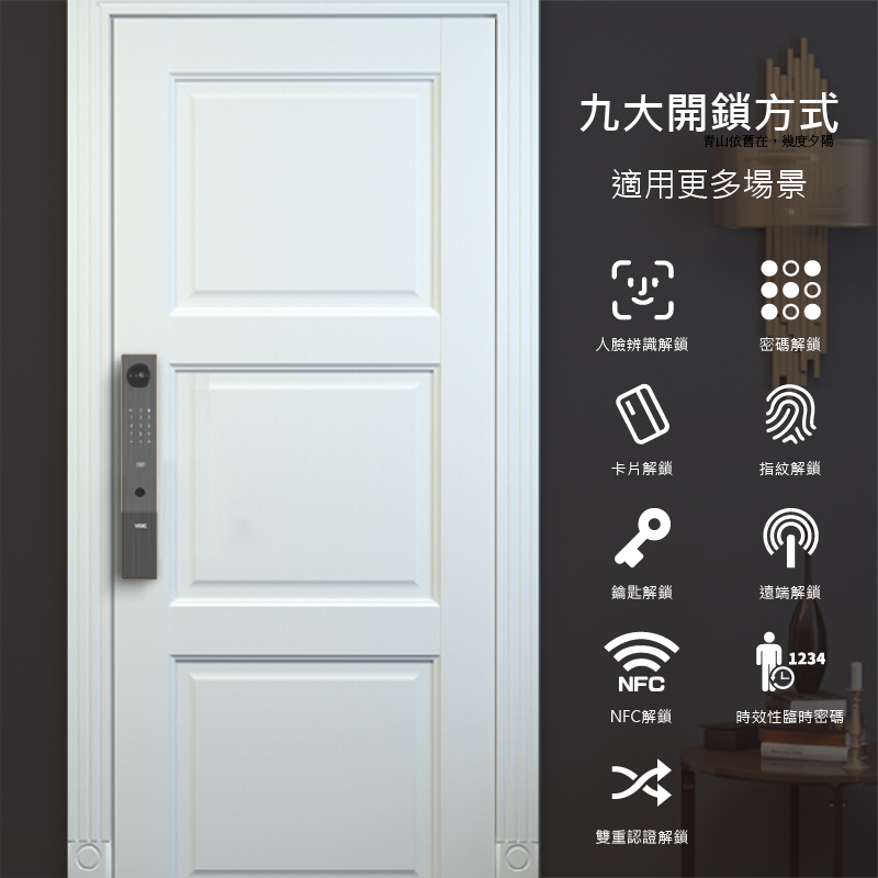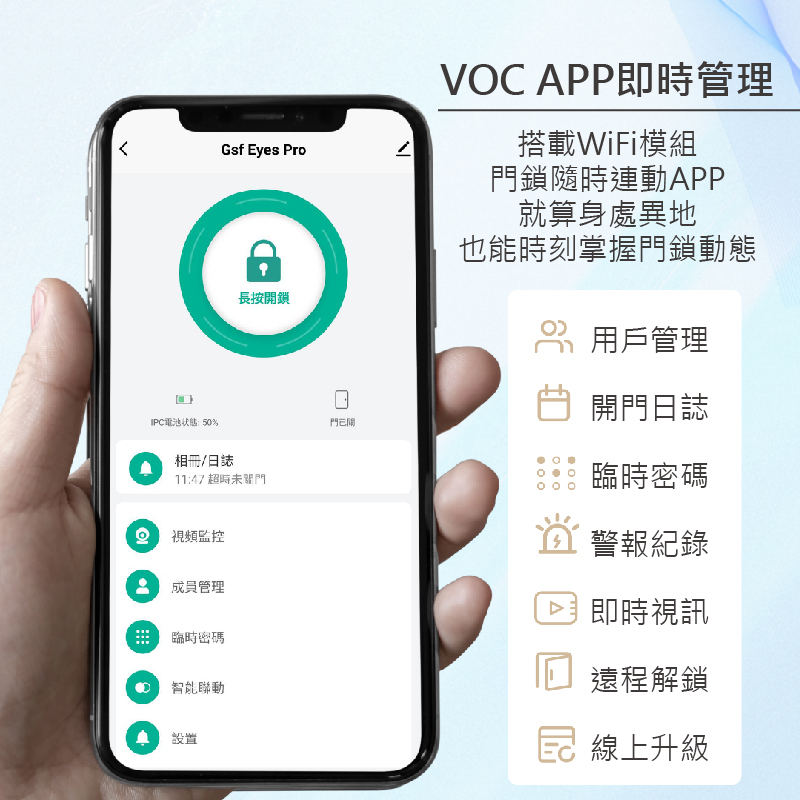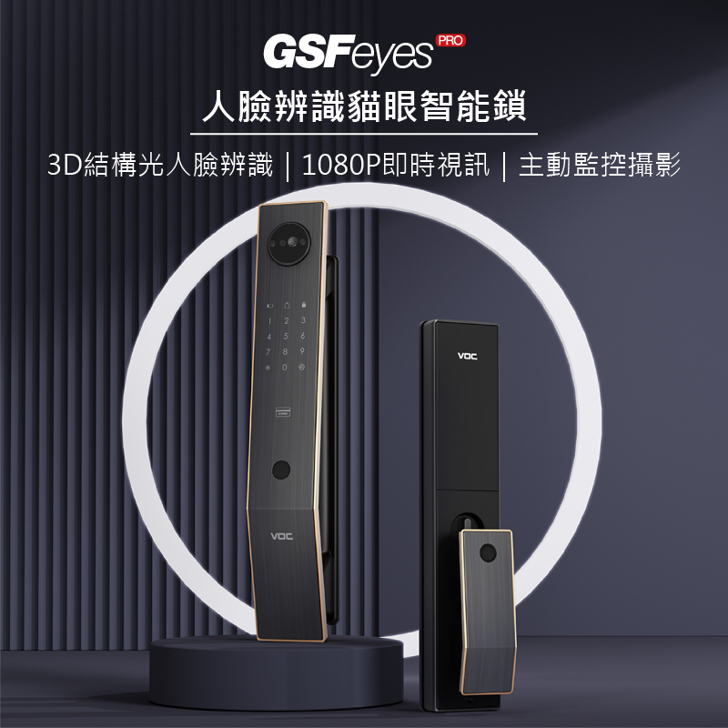 VOC電子鎖 SOLO GSF Eyes Pro 九合一電子門鎖是VOC目前所推出功能最強大的旗艦款大門電子鎖,當出門工作不在家期間可透過手機APP查看門外訪客、外出能也能遠端掌握家門外狀況;當有訪客按下門鈴時,手機APP會自動推播讓主人看清楚門外的狀況,確認訪客後再開門提升居家安全,當外出時還可透過手機App遠端與訪客溝通,並在有訪客按門鈴時從視訊貓眼自動錄製影片,在手機App中查看歷史影片;當發現有人在門前逗留時,鎖體拍攝短影片並推播警報訊息至手機App 。用戶可透過手機連接貓眼進行語音溝通,還可有效嚇跑盜賊;手機APP還能自動記錄成員回家時間,掌握家人每天的回家時間。