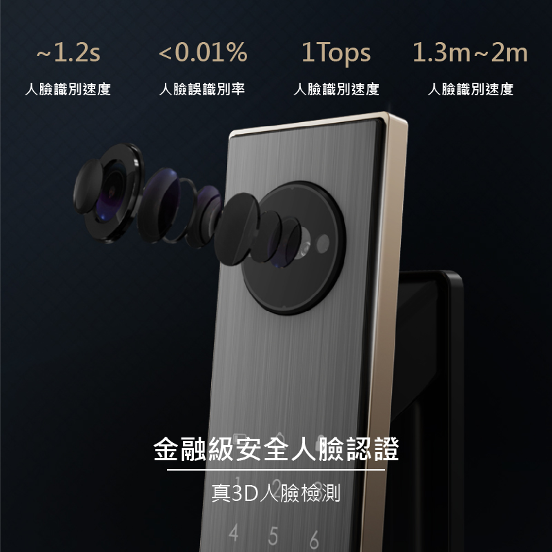 - 人臉辨識:3D 人臉辨識 50 組 可設定管理者、使用者、訪客三種權限,合計最多支援50 組,每組都能單獨刪除單獨增加。