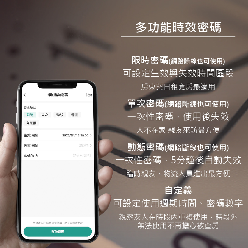 - 使用者權限管理功能【管理者權限、使用者權限、訪客權限】關門立即自動上鎖