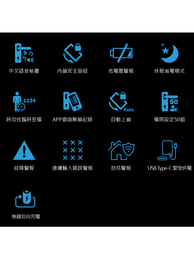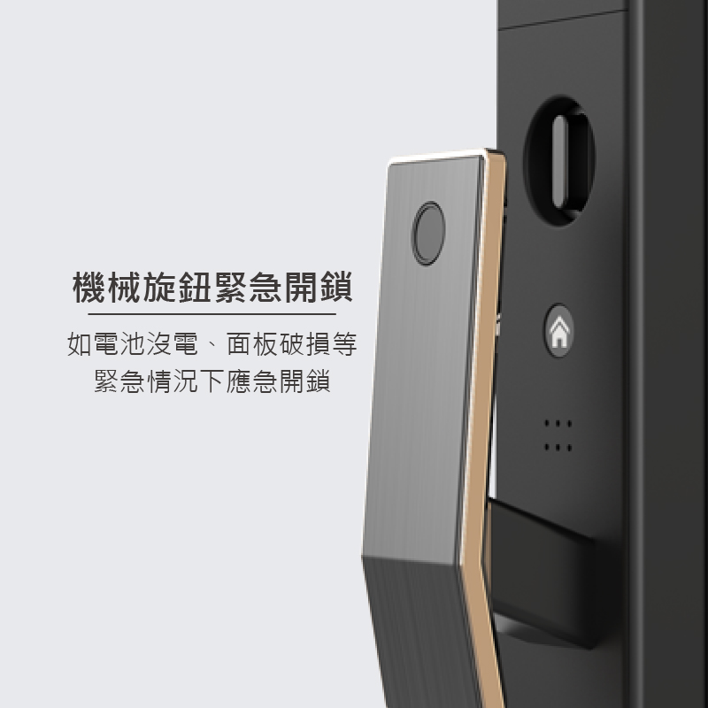- 內鎖安全鈕,只有管理者、使用者及機械鑰匙可從外面打開