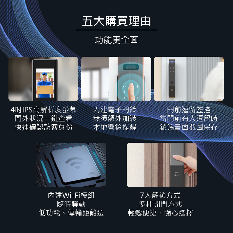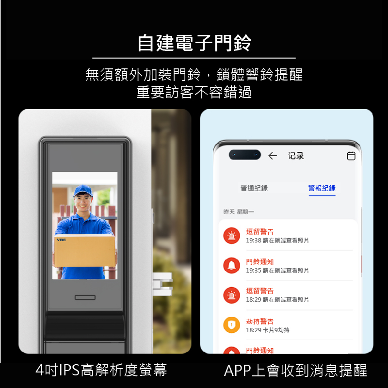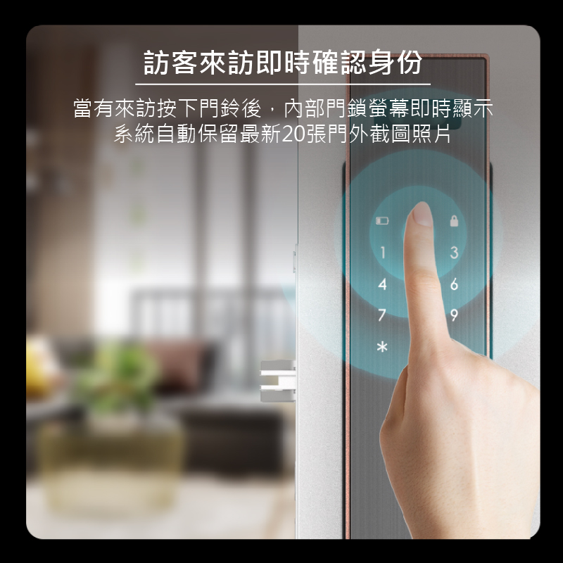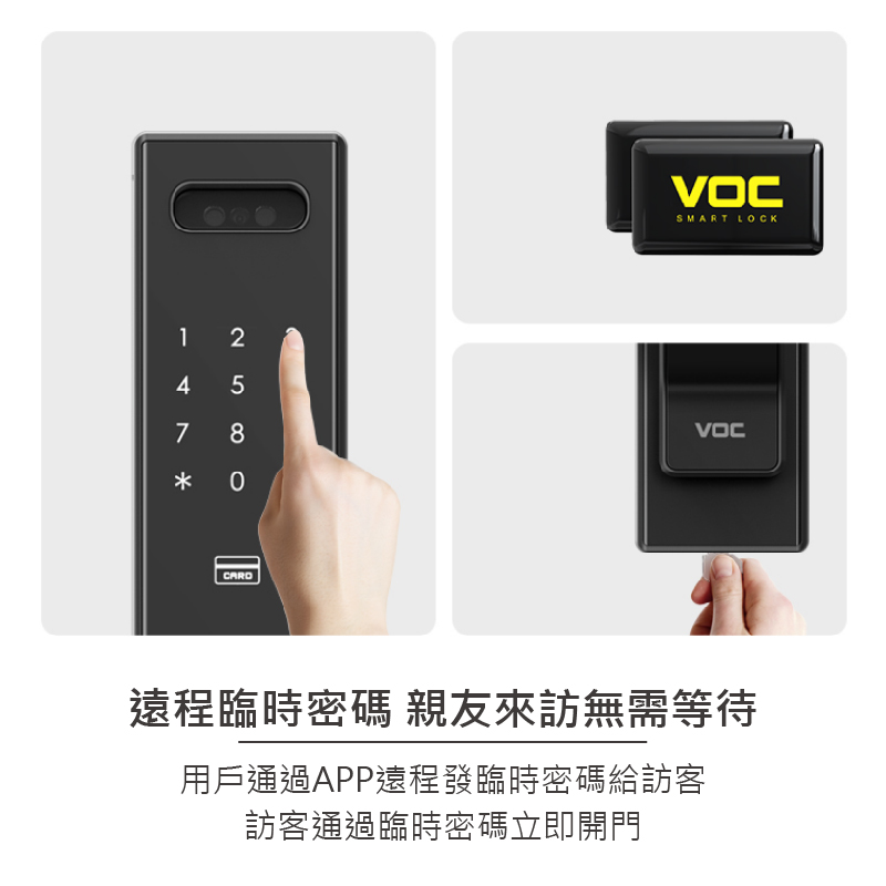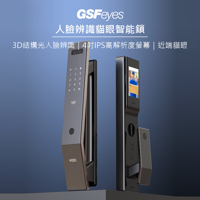 VOC SOLO GSF Eyes九合一電子鎖是VOC目前所推出功能最強大的旗艦款門鎖,當有訪客按下門鈴時,內鎖螢幕會自動喚醒讓家中成員一眼看清楚門外的狀況,確認訪客後再開門提升居家安全,並在有訪客按門鈴時從視訊貓眼自動拍攝照片,在內鎖螢幕中查看歷史照片;當發現有人在門前逗留時,鎖體拍攝照片至內鎖螢幕中。手機APP還能自動記錄成員回家時間,掌握家人每天的回家時間。