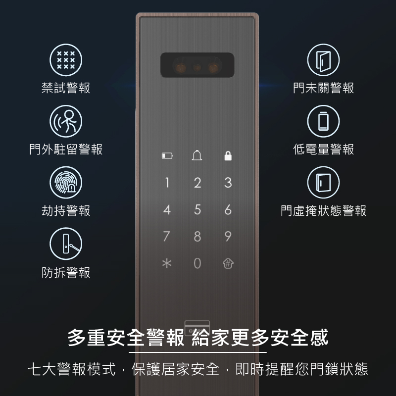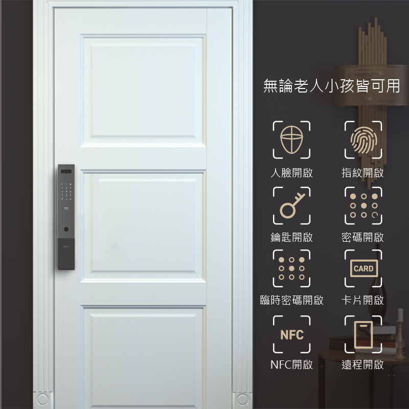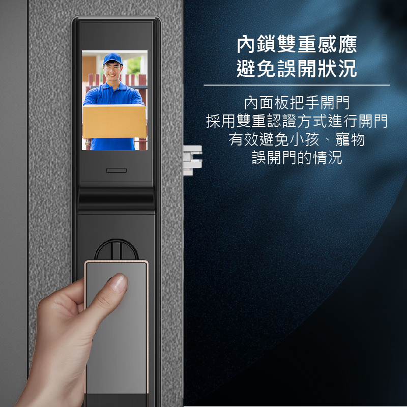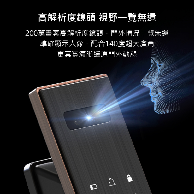 視訊鏡頭具備紅外線功能,可全天候看清門外視野,支援AI人臉識別演算法、指紋鎖功能,能辨識各種面容資訊,下次使用時能更快速完成辨識,鎖體內建5,000mAh大容量鋰電池,當電量過低時,手機App自動推播低電通知,內、外門鎖採用航空級別合金材質,面板表面採用IML工藝,霧面質感搭輔以絲紋理,不易沾染指紋和灰塵。同時搭配側邊的金屬色邊框,給人一種高貴精緻的感覺,適用市面上絕大多數的門扇。