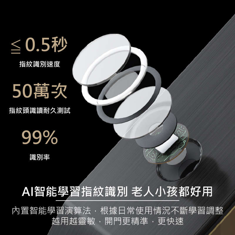 - 指紋設定數量:50 組 可設定管理者、使用者、訪客三種權限,合計最多支援50組,每組都能單獨刪除單獨增加。