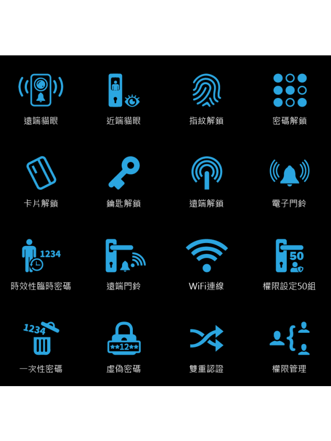 - 指紋設定數量:50 組 可設定管理者、使用者、訪客三種權限,合計最多支援50組,每組都能單獨刪除單獨增加。