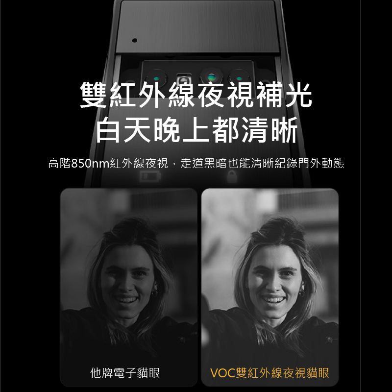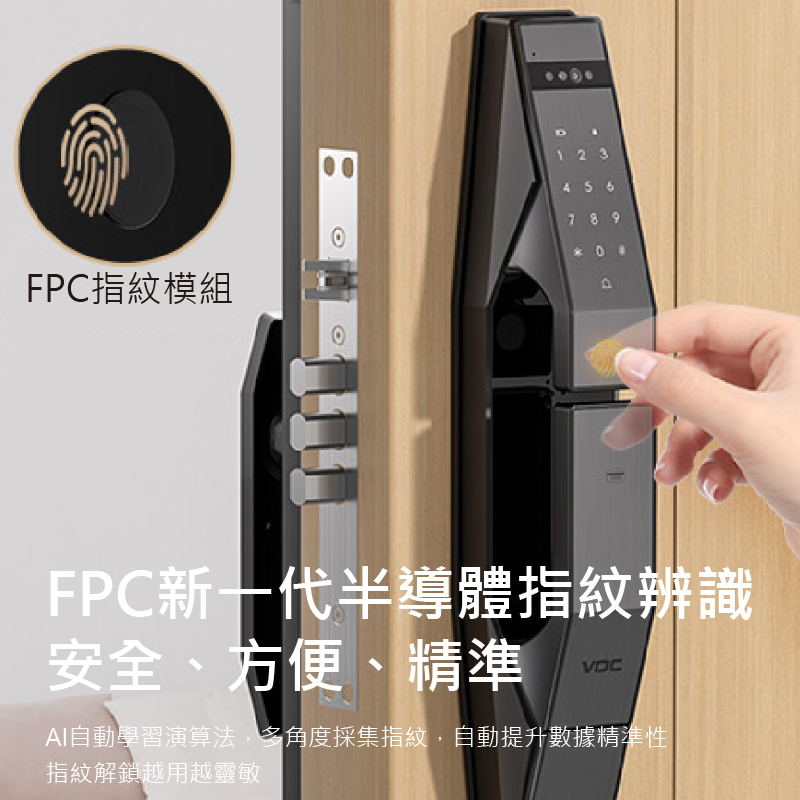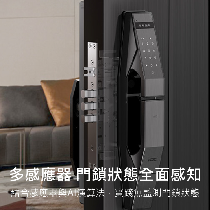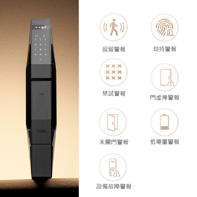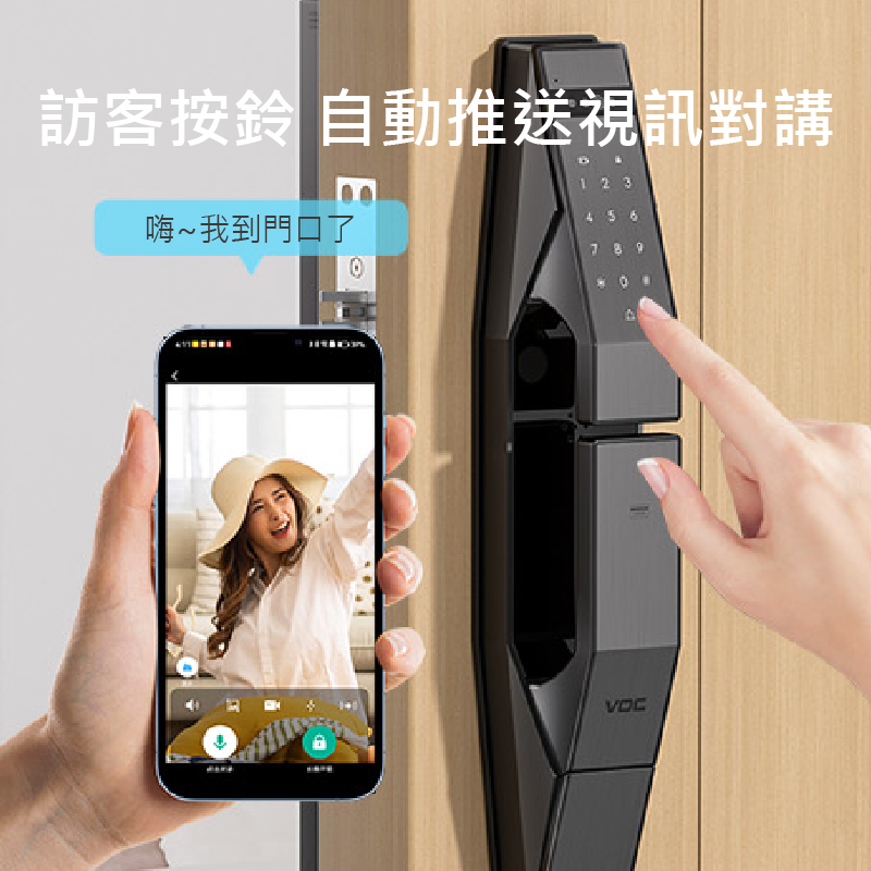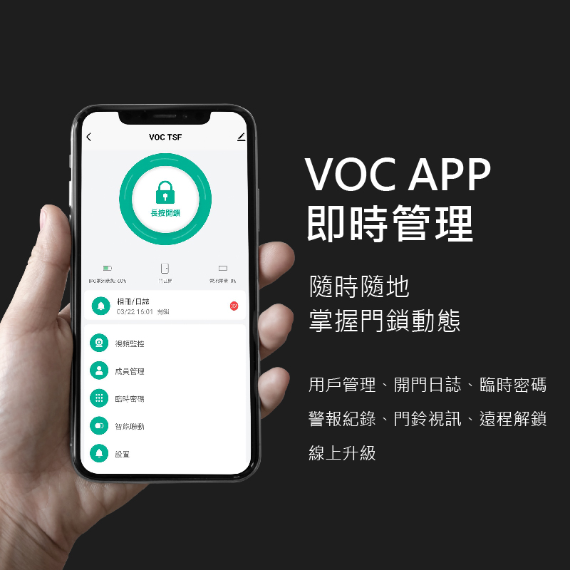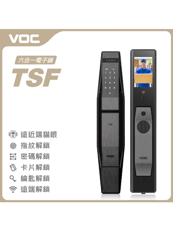VOC TSF 六合一電子鎖當有訪客按下門鈴時,內鎖螢幕會自動喚醒讓家中成員一眼看清楚門外的狀況;當有訪客按下門鈴時,手機APP會自動推播可透過手機APP遠端與訪客視訊溝通,且讓主人看清楚門外的狀況,確認訪客後再開門提升居家安全,當外出時;當發現有人在門前逗留時,鎖體拍攝短影片並推播警報訊息至手機App ;當發現有人在門前逗留時,手機會收到推播警報並可啟動主動貓眼功能查看門口影像 ;手機APP還能自動記錄成員回家時間,掌握家人每天的回家時間。