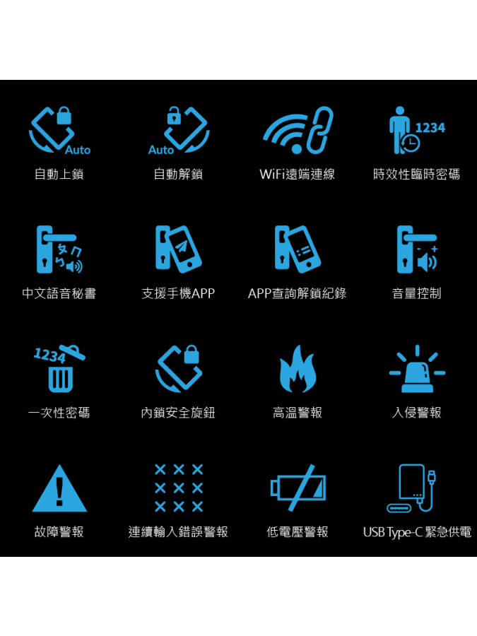- 鎖體外殼材質:鋅合金+ 特殊製程烤漆、外殼ABS 塑膠